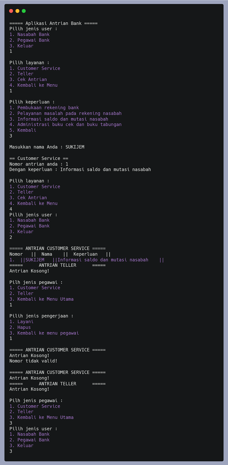 a. Antrian di Bank seperti yang kita ketahui memiliki sifat FIFO (First In First Out). Untuk membuat program antrian bank, kita akan membutuhkan struktur data yang juga memiliki sifat FIFO. Struktur data yang akan digunakan adalah Queue/Antrian.